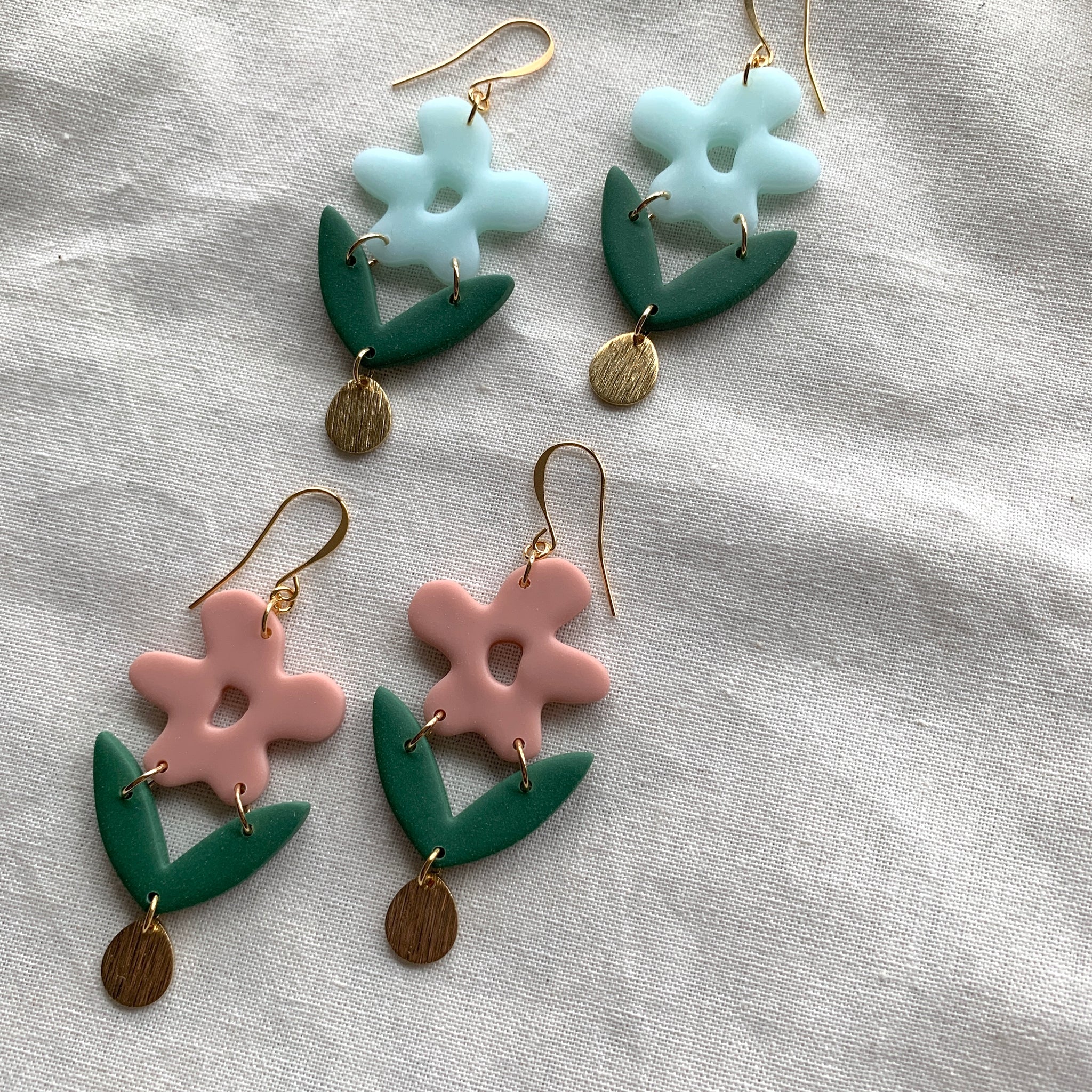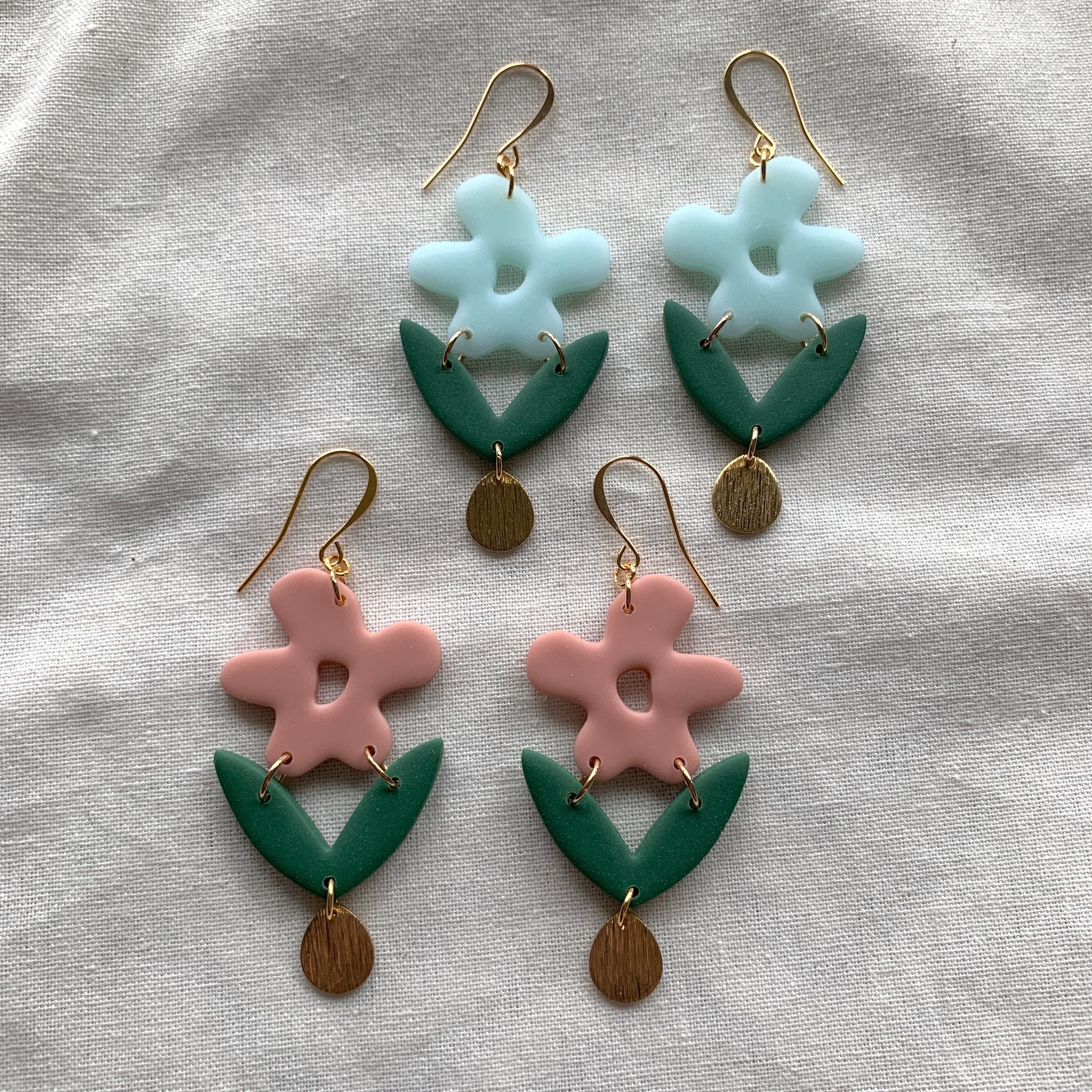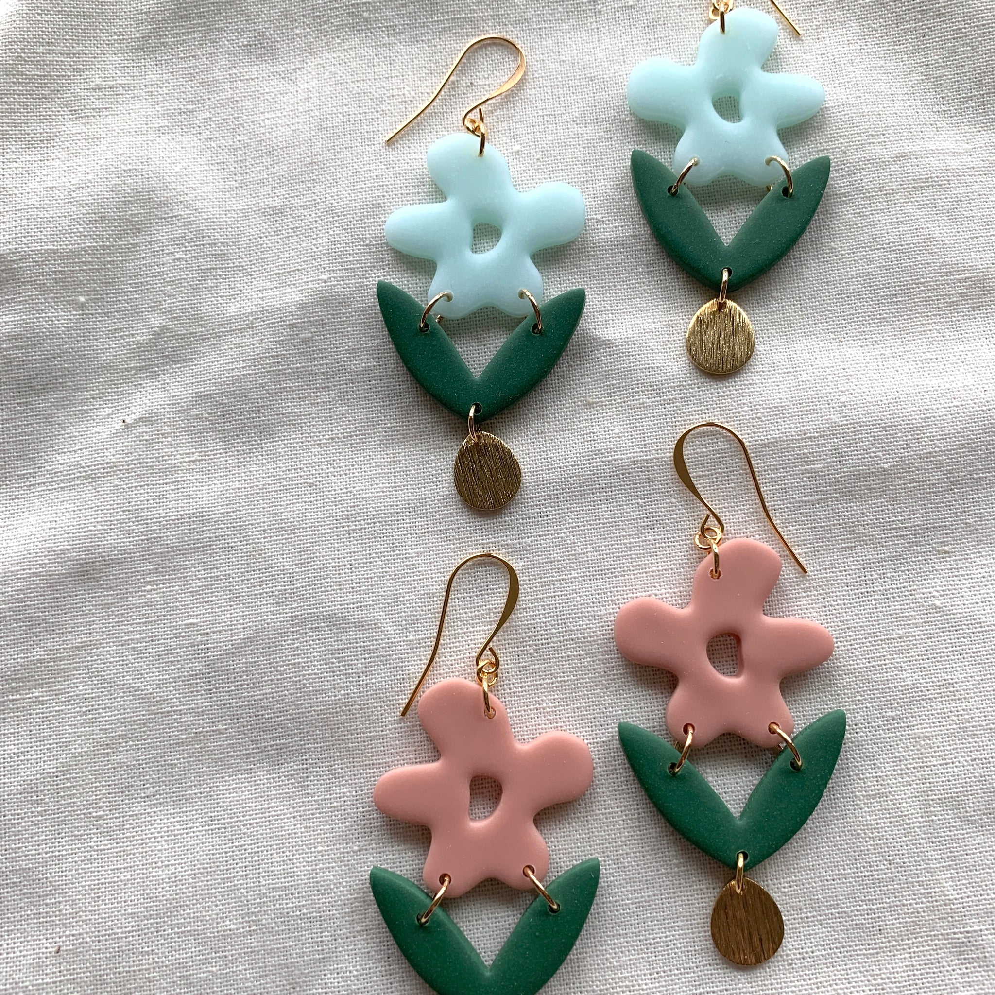 Earrings are handmade in very small batches of polymer clay by Dylan in her home studio. Every piece is cut, sanded, and assembled by hand. They are lightweight and durable, but please handle with care. Due to the nature of handmade pieces, there may be small imperfections; no two pieces are 100% alike! Also please note the color of earrings may slightly differ due to computer monitor settings.