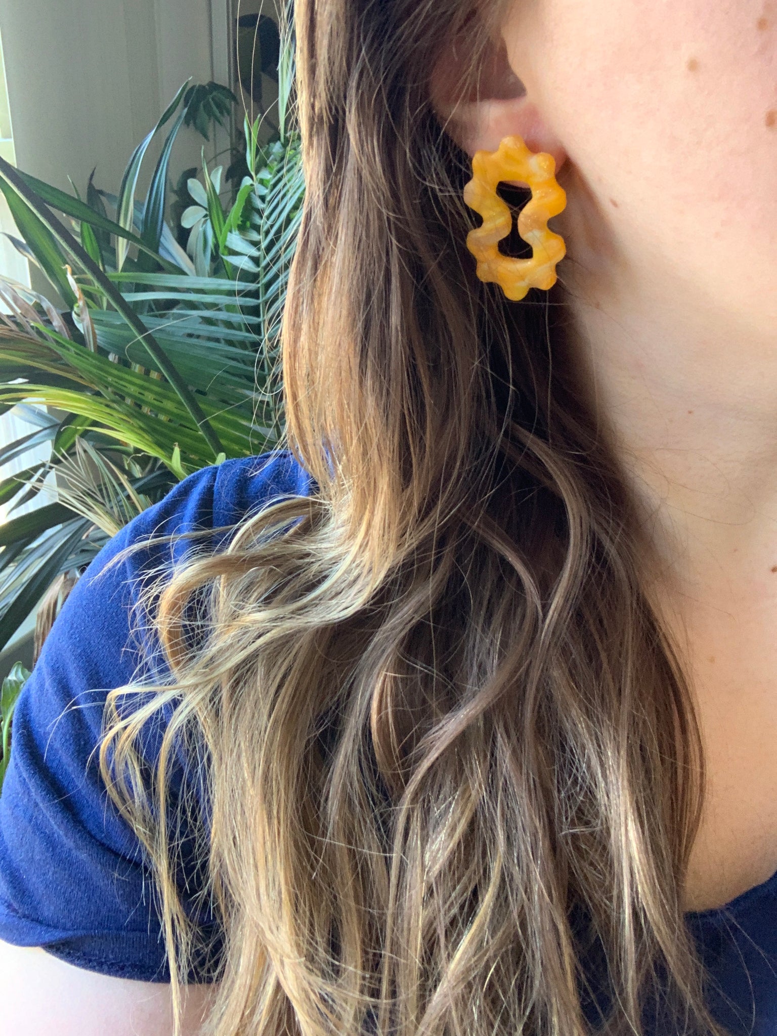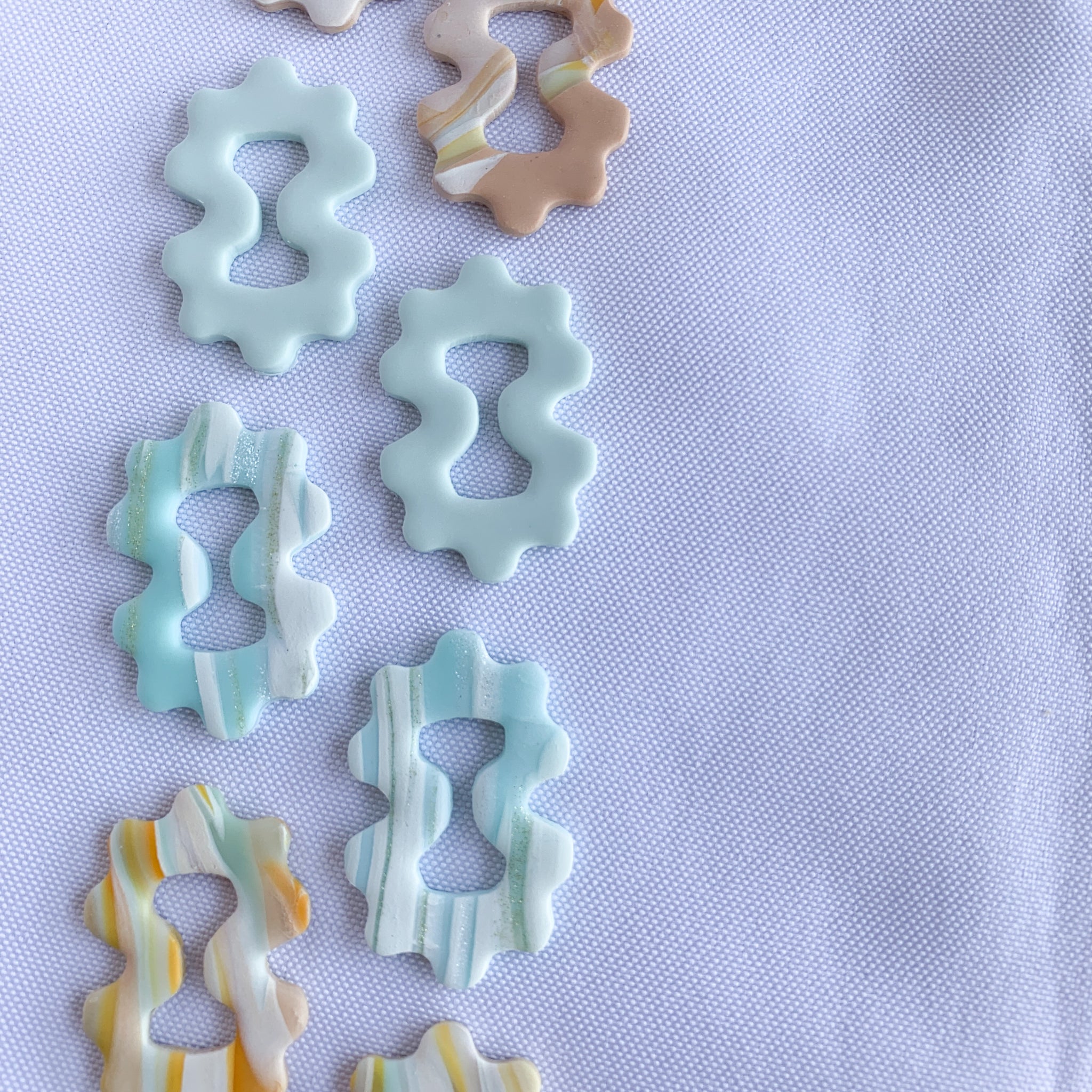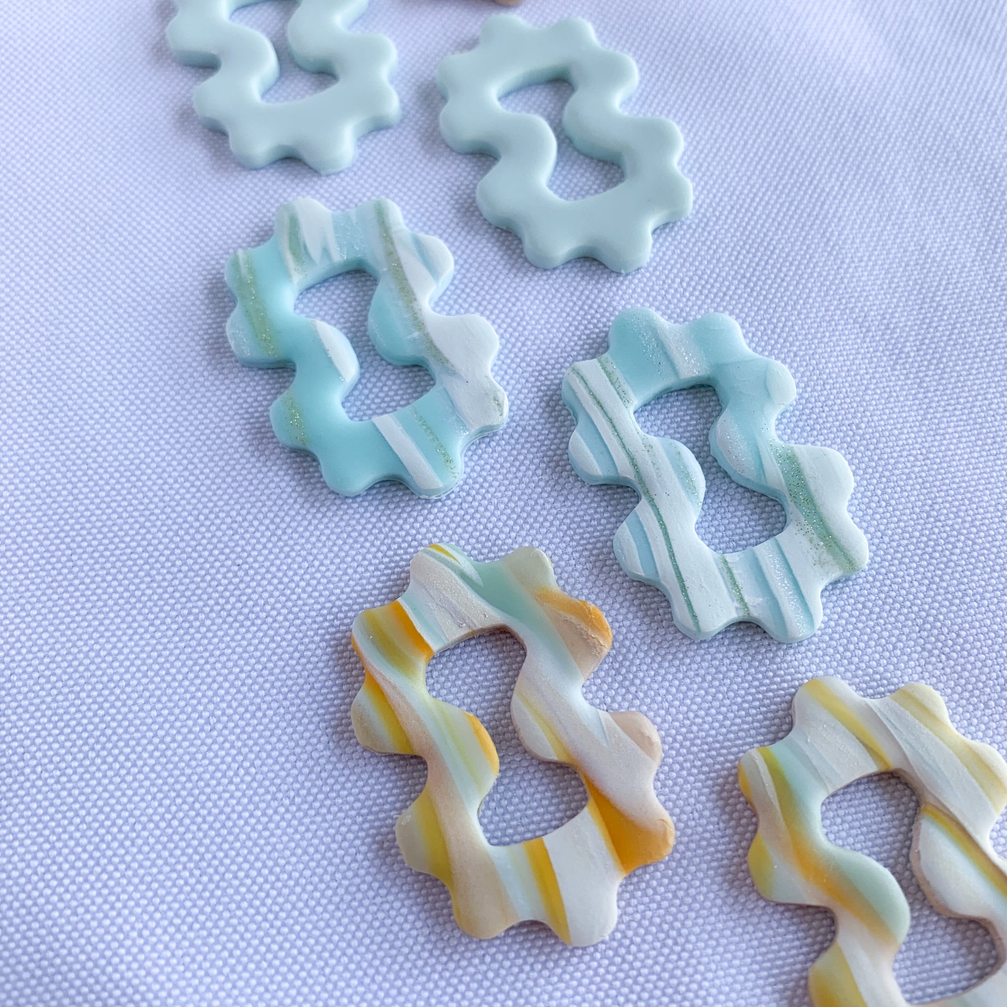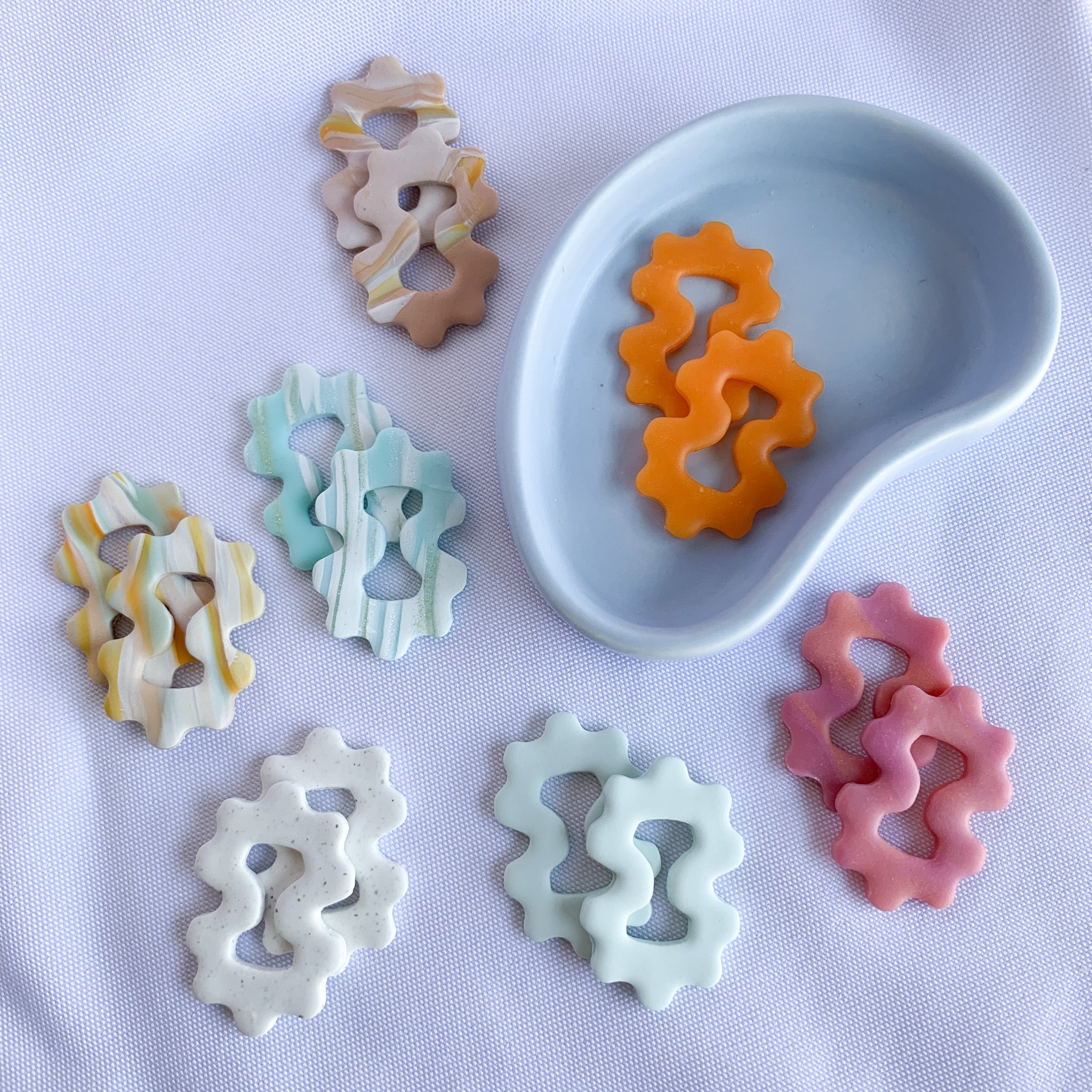 All earrings are handmade in very small batches of polymer clay. They are lightweight, but not as durable as metal or plastic, so please handle with care. Every piece is cut, sanded, buffed, and assembled with love by us. Due to the nature of handmade pieces, there may be slight variations or imperfections; no two pieces are 100% alike! Also please note the color of earrings may slightly differ due to computer monitor settings.